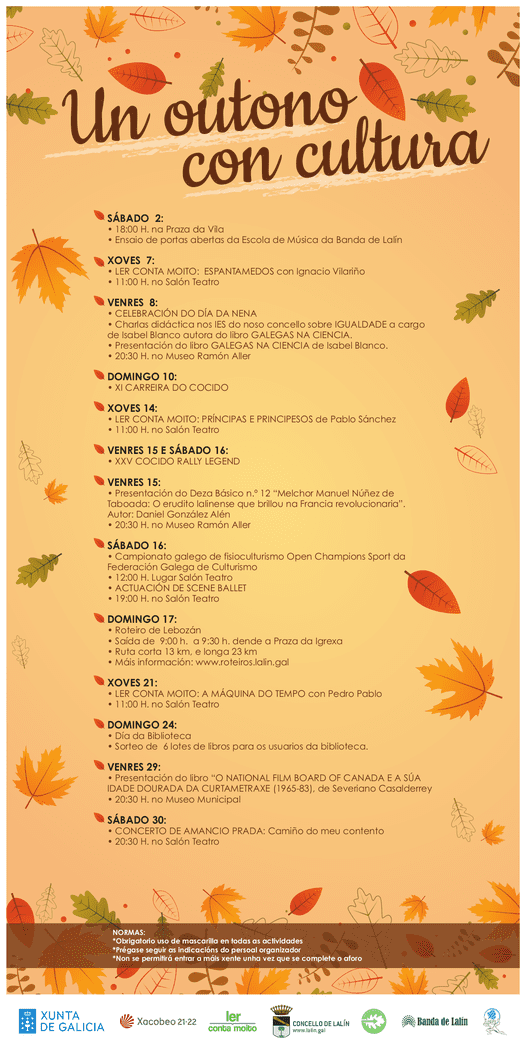 Xa arrancou a programación cultural de outono do Concello de Lalín, que abarca gran parte do mes de outubro. É moi varidas e está pensada para as distintas idades e para todos os gustos.